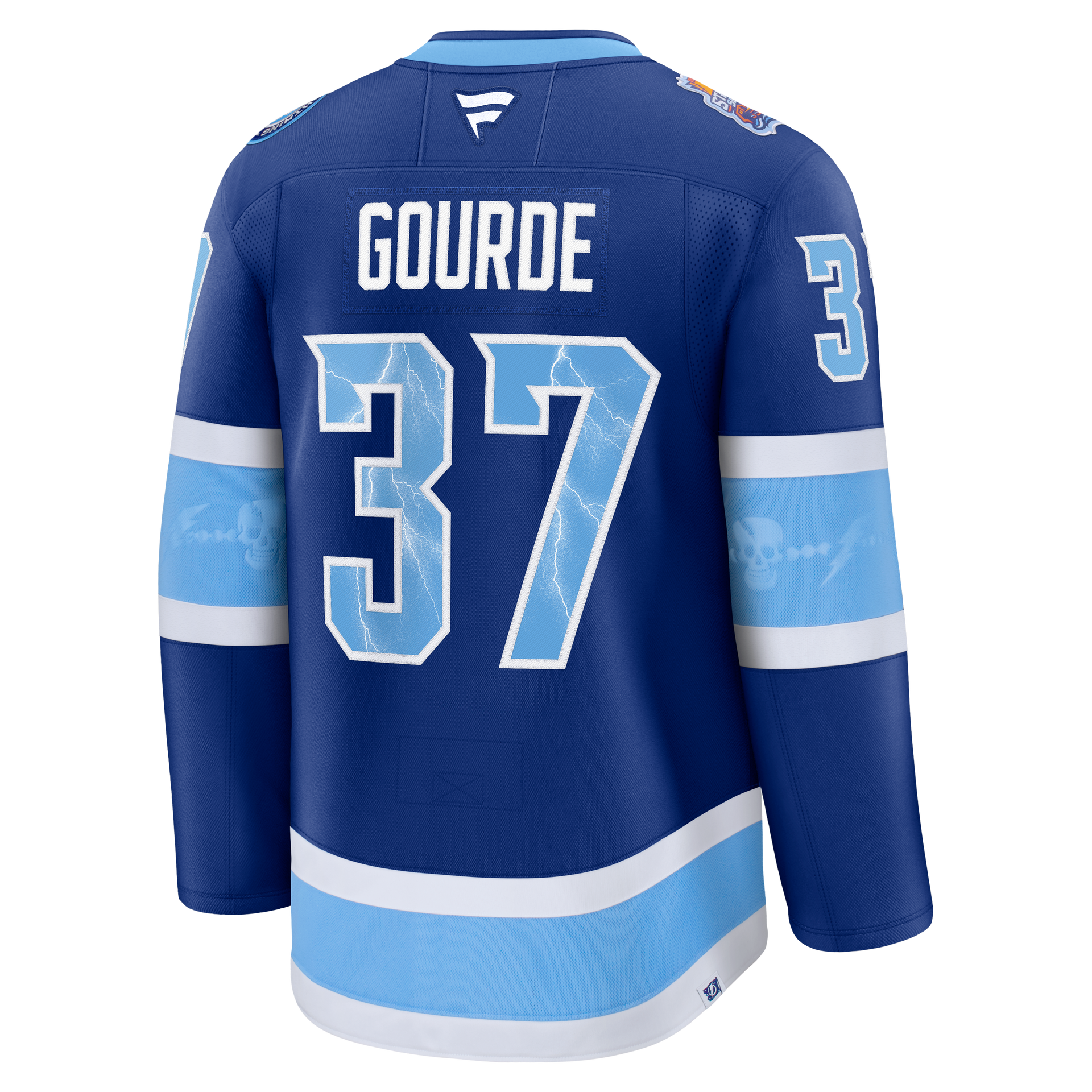 Shoulder patch, sublimated beads inside the collar, and a tattered flag loop label all pay tribute to Tampa's pirate heritage