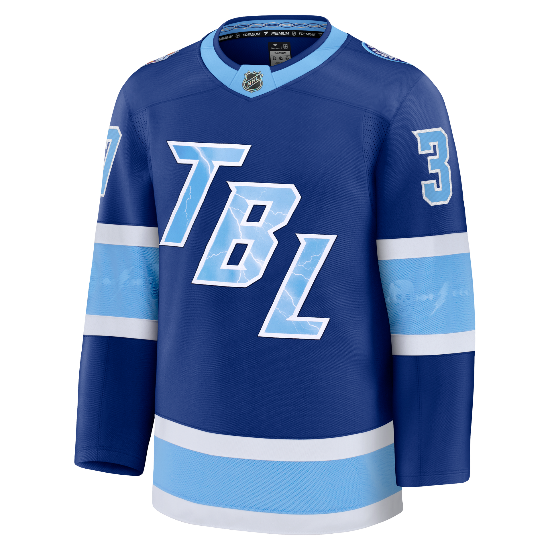 TBL crest and numbers are sublimated with lightning strikes and deploy the same font from the 2022 Stadium Series in Nashville